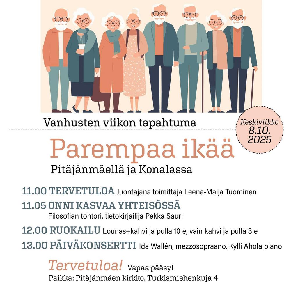 Pitäjänmäen kirkolla järjestetään perinteinen Vanhustenviikon tilaisuus Parempaa ikää Pitäjänmäellä ja Konalassa keskiviikkona 8.10.2025 klo 11-14.